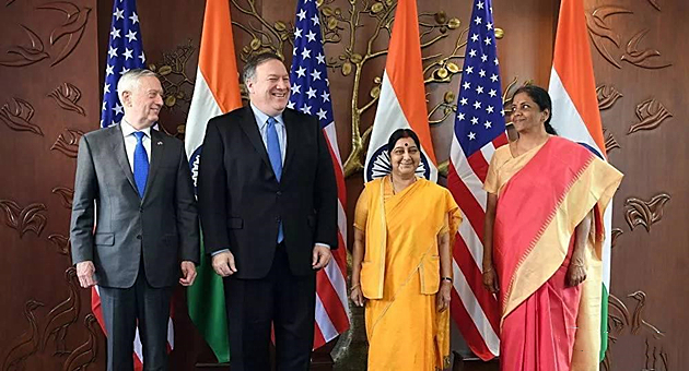 2018年9月6日新德里,美国国务卿蓬佩奥和国防部长马蒂斯与印度外长斯瓦拉杰和印度防长希塔拉曼会谈