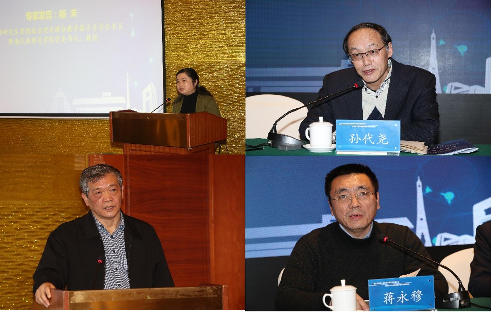 党委书记杨未委员从注重问题导向、目标导向和结果导向的维度;北京大学教授孙代尧委员就政治性和学理性的统一;中山大学教授钟明华委员就博士生培养质量问题;四川大学教授蒋永穆委员就习近平新时代中国特色社会主义思想概论课的开设;天津师范大学教授王秀阁委员就研究生思想政治理论课入脑入心问题;吉林大学教授邵彦敏委员就平台建设;云南大学教授李兵委员就用学术讲政治;北京化工大学张明国教授就混合式教学模式问题等做了主题发言。