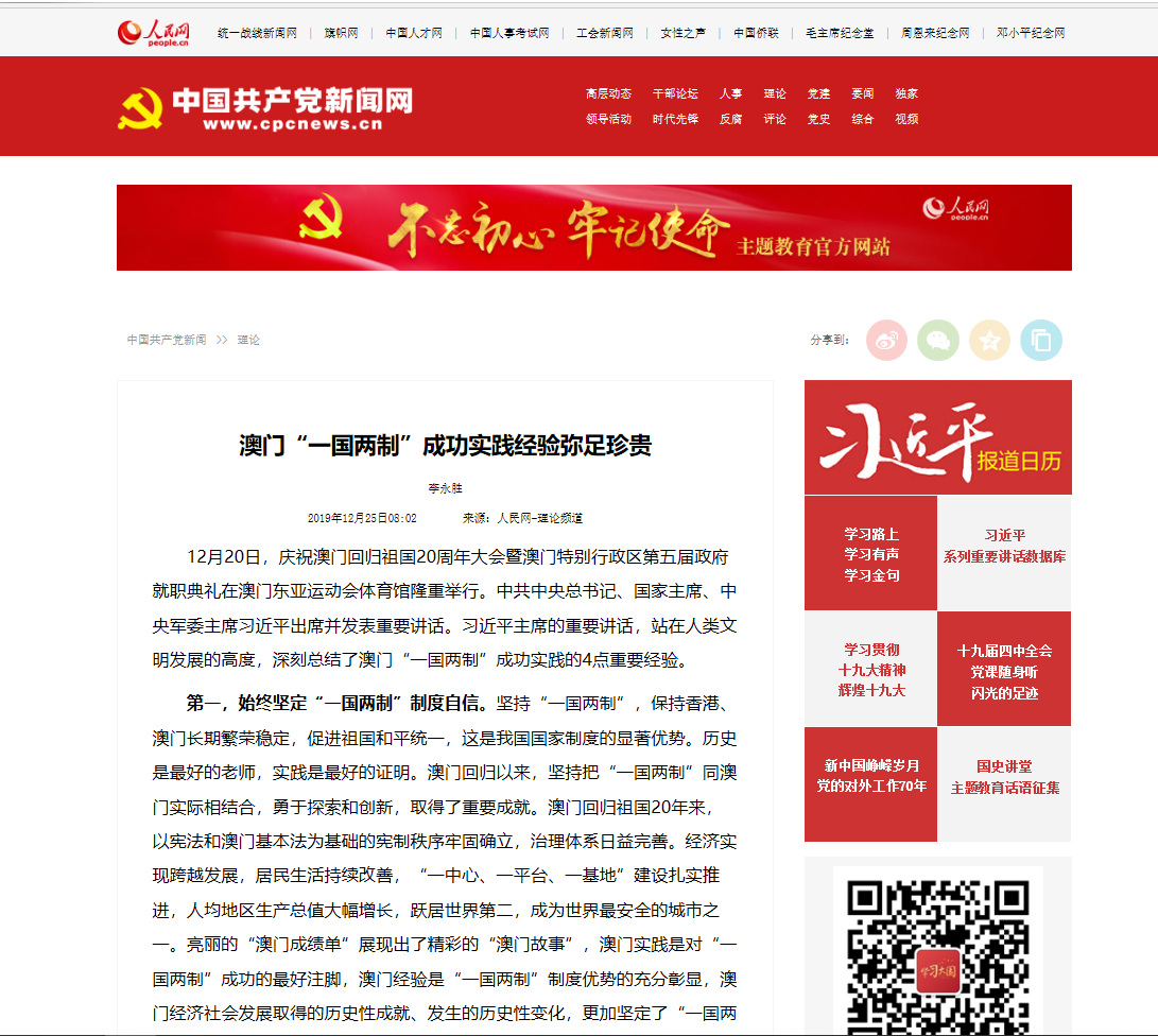 【人民网】李永胜:澳门“一国两制”成功实践经验弥足珍贵