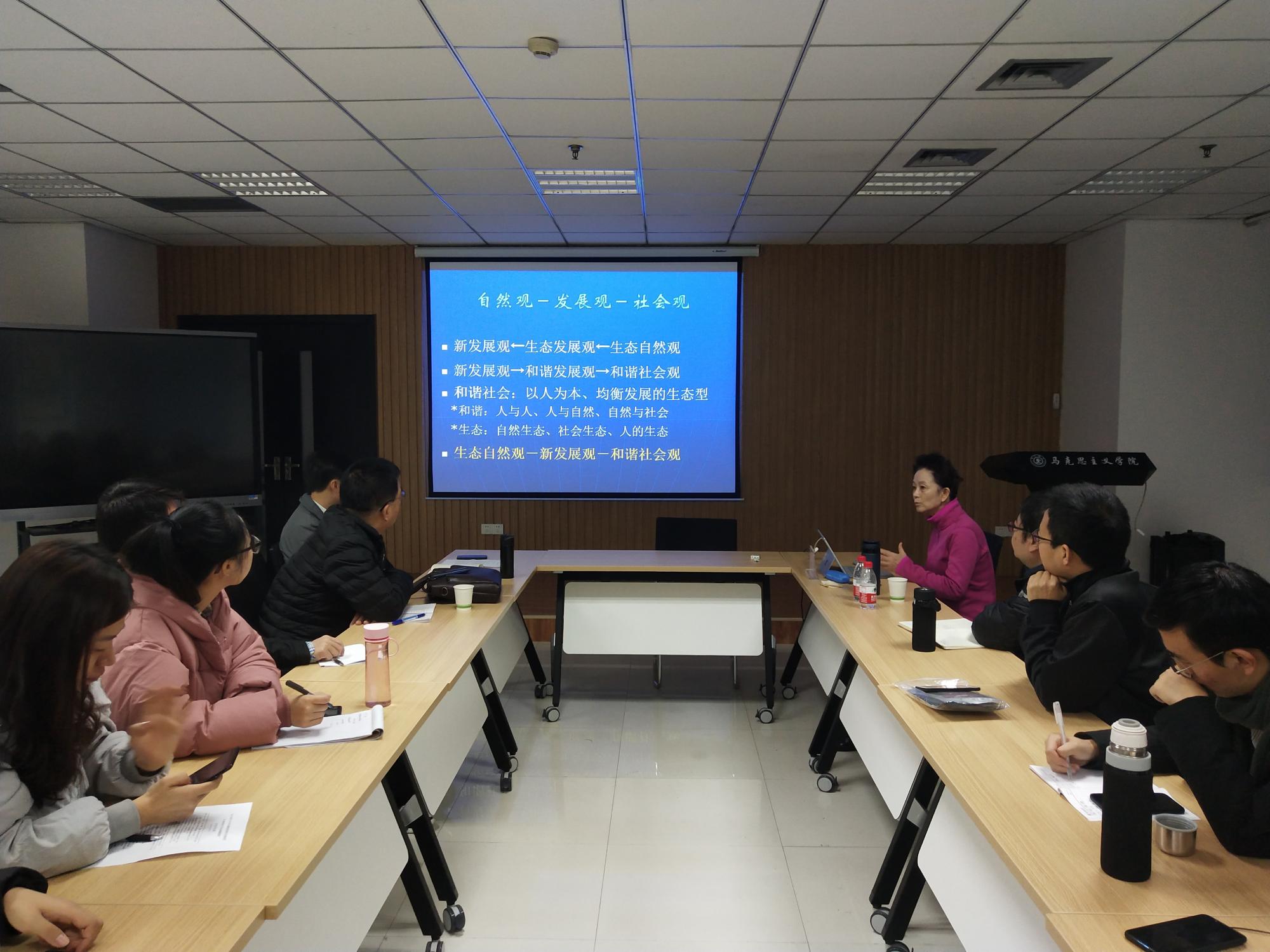 萧玲教授首先从经济生活、政治生活、社会生活三个方面介绍了新发展观的形成背景,在此基础上揭示了新发展观的科学内涵。接着,她分别从发展观与自然观、经济观、社会观的关系角度,对新发展观进行了“人—自然—社会”多重关系角度的阐释。她认为,绿色发展观、生态自然观与和谐社会观是相辅相成的,必须要遵循发展的自然法则和道德法则,正确处理人与自然、人与社会、人与人之间的关系,从而更好地解决自然和人性的双重危机。最后,她从哲学角度探讨了新发展观的理论与现实意义。